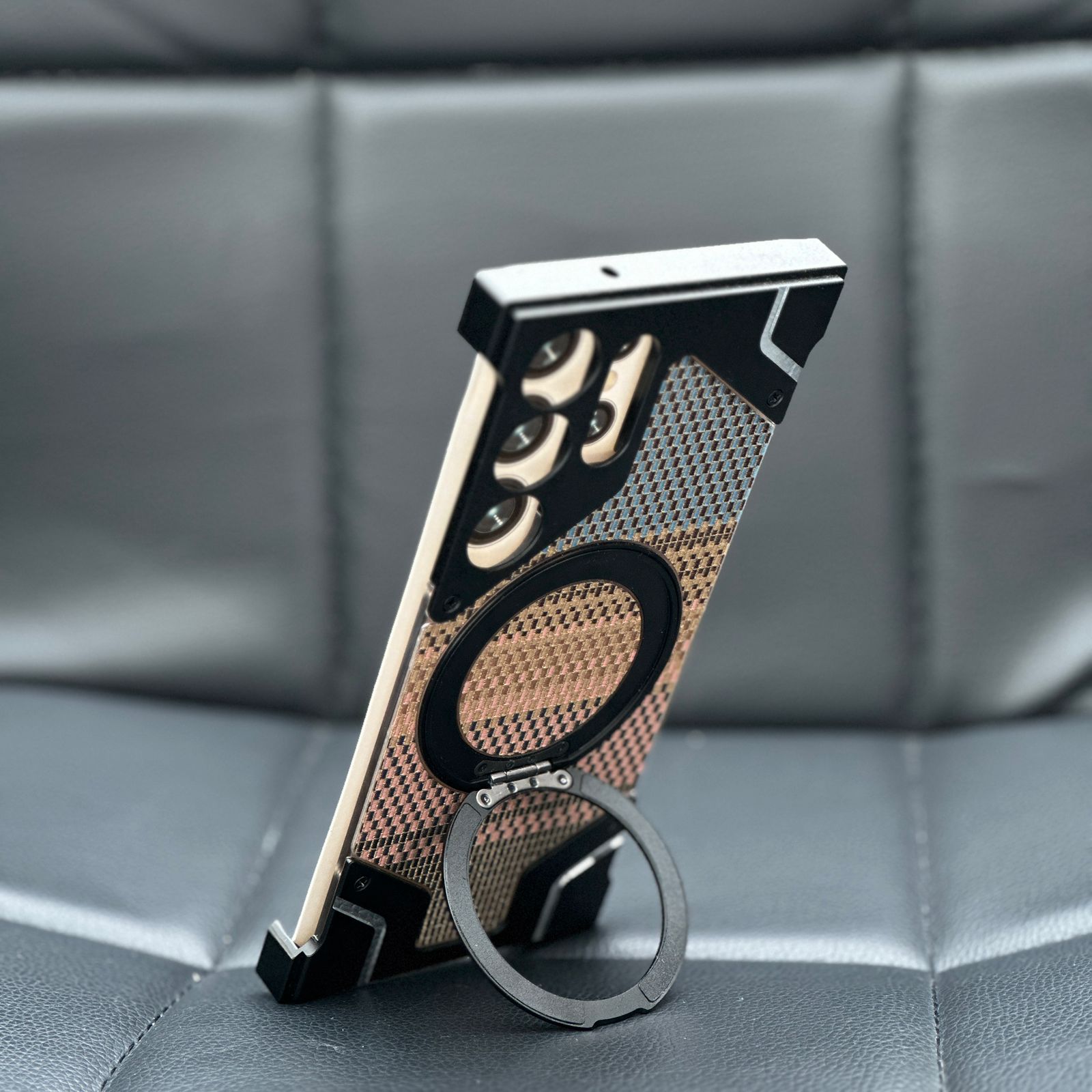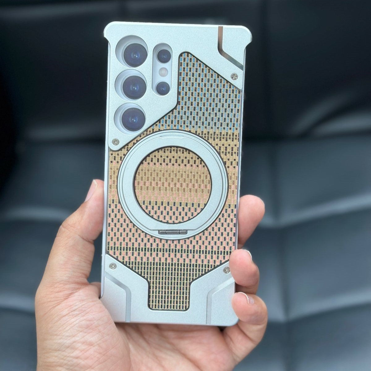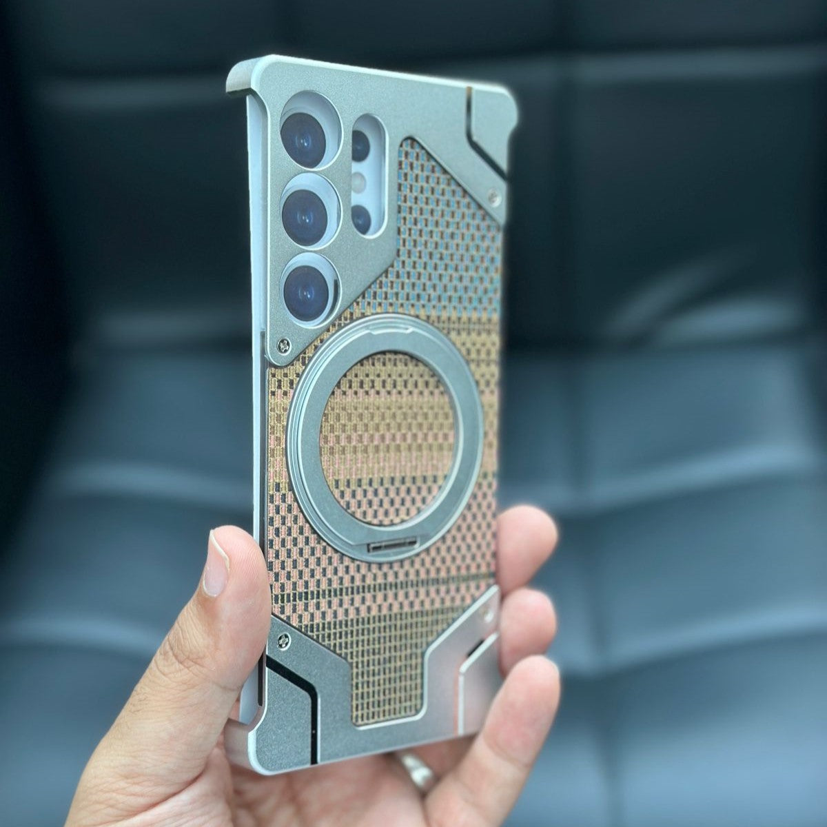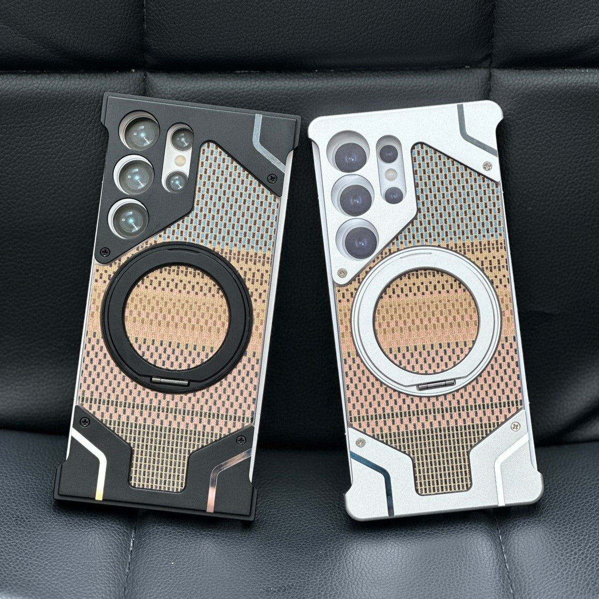 Professional Camera Protection: Equipped with a raised metal frame (often aluminum) to protect the camera lenses from direct contact and scratches on flat surfaces.