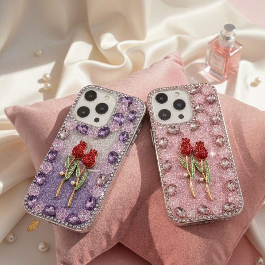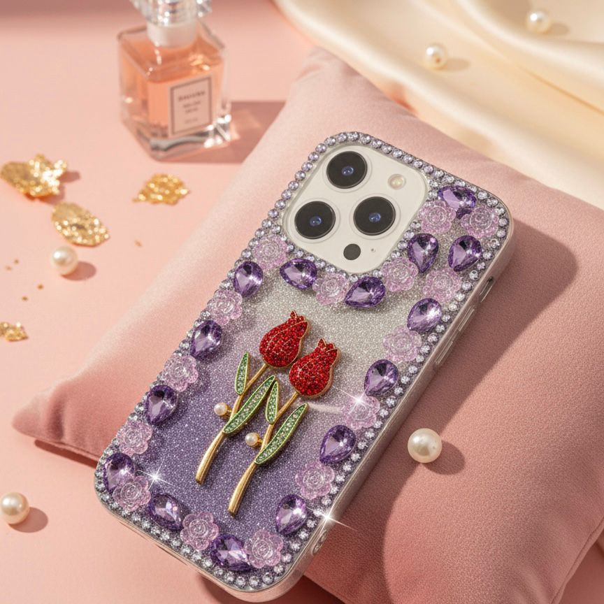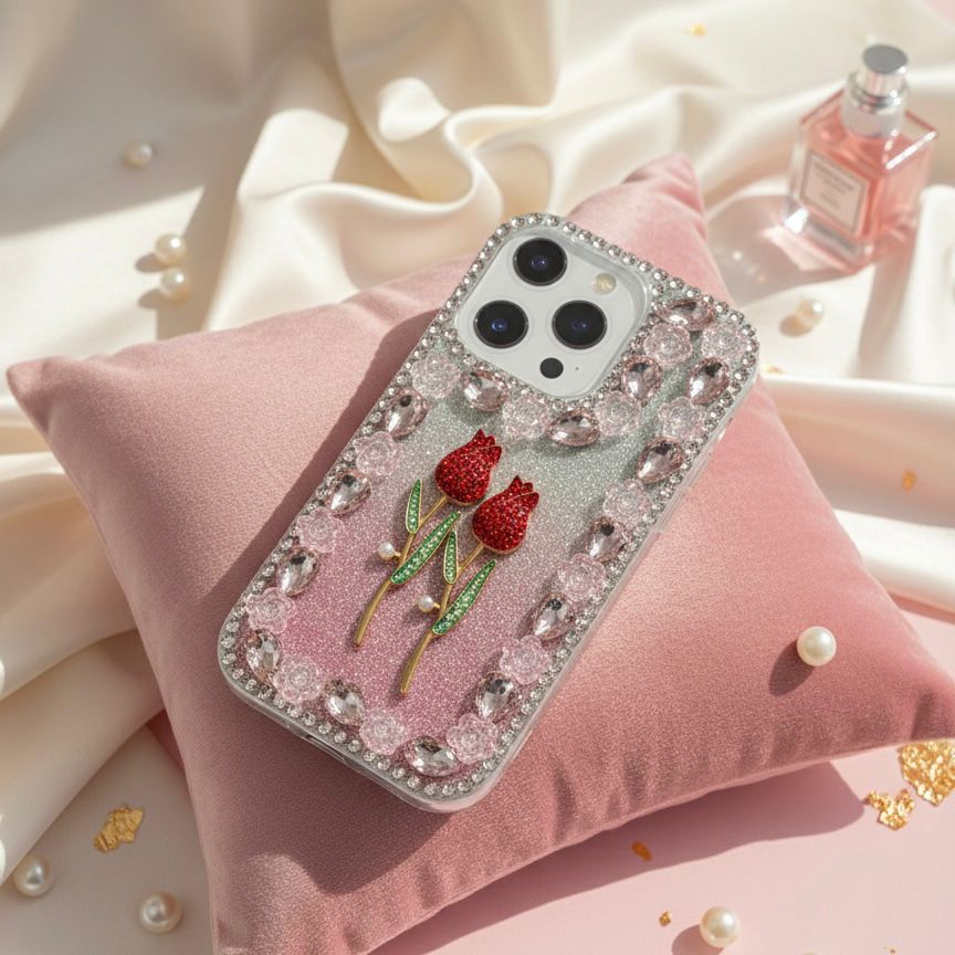 Carry a Masterpiece in Your Hand. Elevate your everyday tech with our Handcrafted 3D Tulip Gemstone Case. This isn't just a phone cover; it’s a statement of elegance. Featuring a stunning pair of ruby-red tulips set against a shimmering glitter backdrop, each case is meticulously framed with hand-placed crystals and oversized teardrop gems.