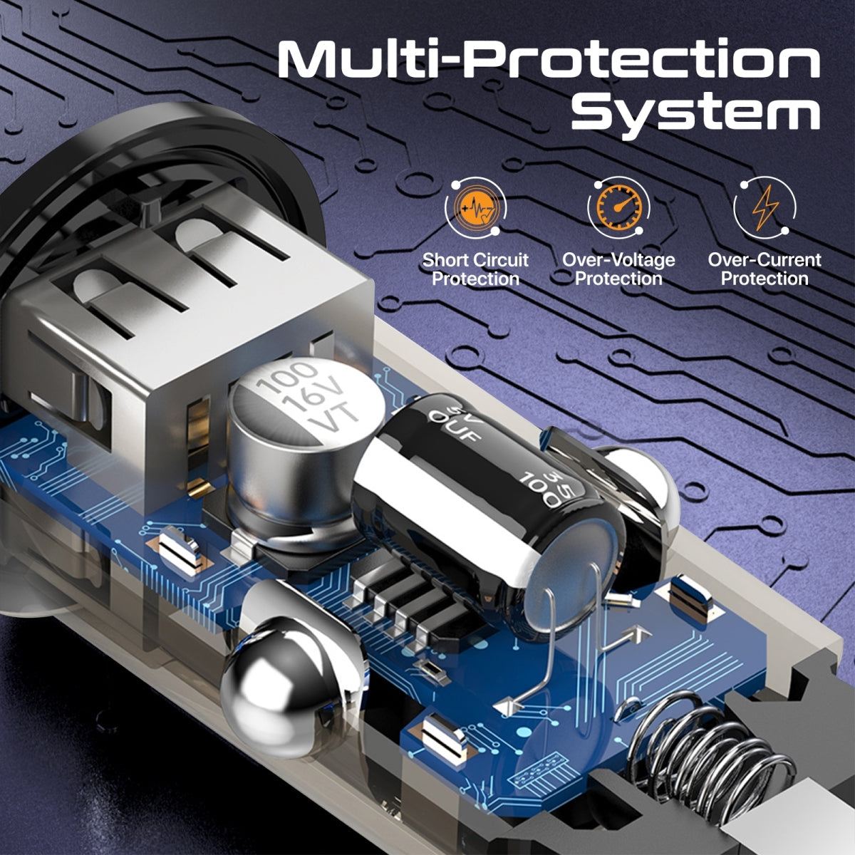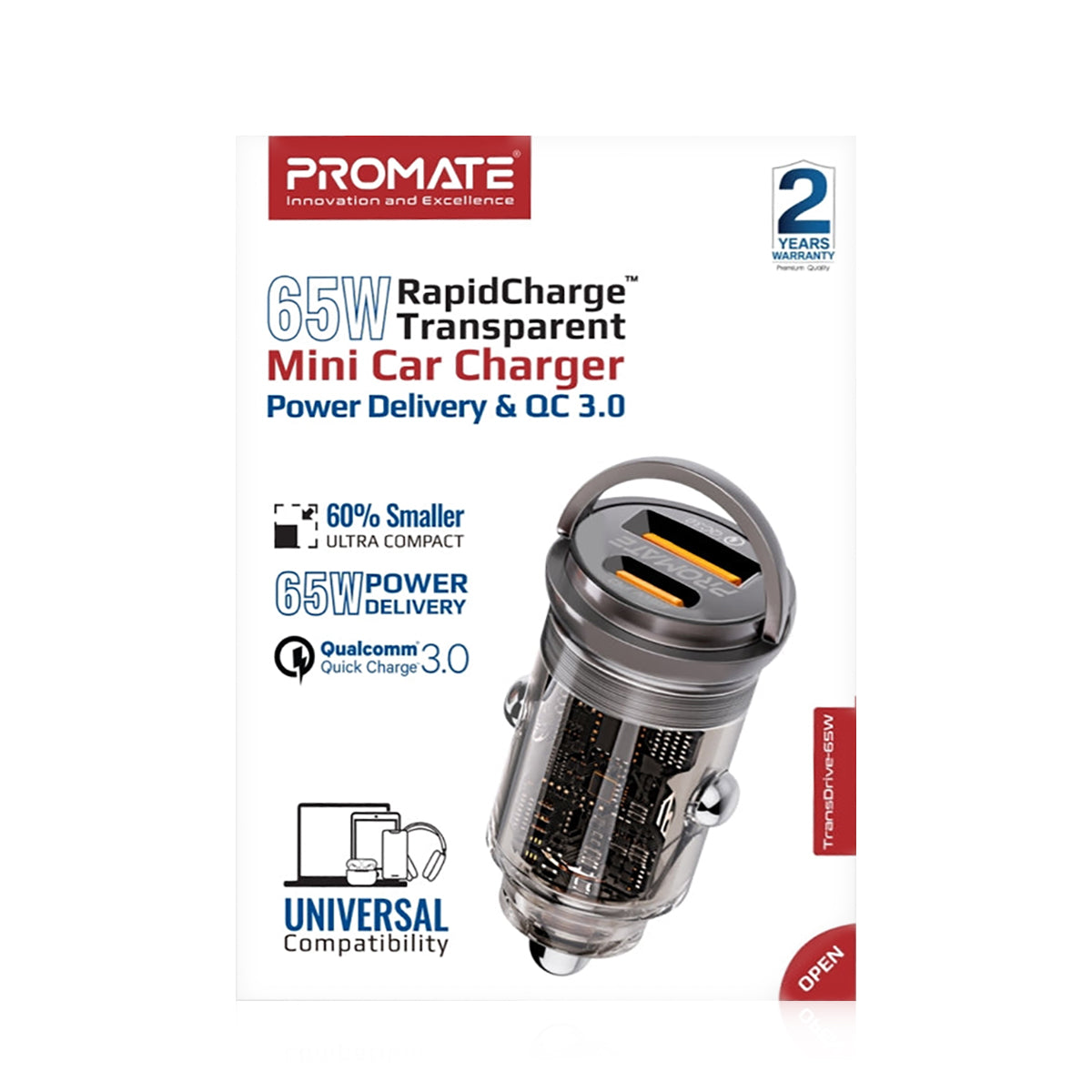 The TransDrive-65W car charger features a 65W Power Delivery USB-C port and an 18W Quick Charge 3.0 port, all in a stylish transparent design. It efficiently charges power-hungry devices like laptops, tablets, and smartphones while on the go. Constructed with premium heat-dissipating materials and IC technology, it ensures safe and rapid charging in both ports.
